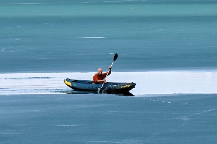 Van’ın Gürpınar ilçesinde sporseverler, havanın ısınmasıyla yüzeyindeki donmuş tabaka erimeye başlayan Zernek Baraj Gölünde buz kütleleri arasında kano yaptı.