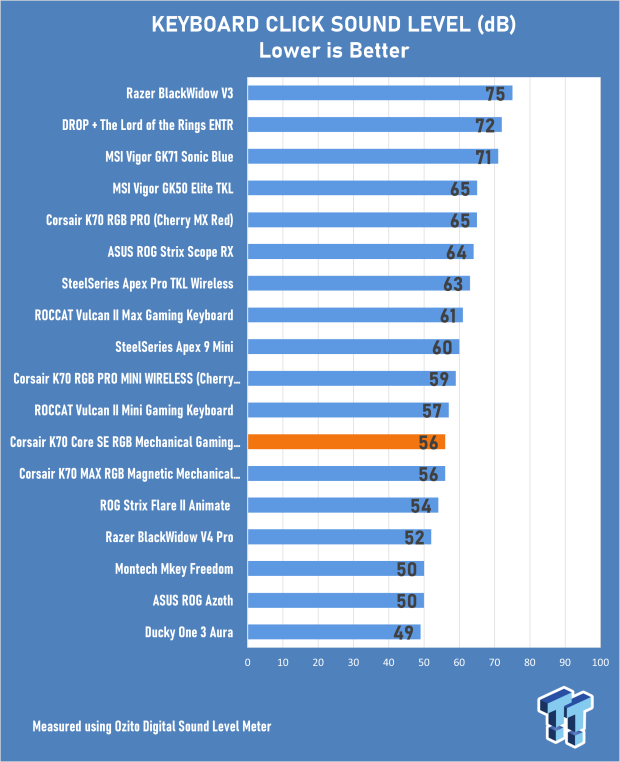 Bir klavyenin genel ses seviyesini test etmek için Ozito Dijital Ses Seviyesi Ölçer kullanıyoruz, “hızlı kahverengi tilki tembel köpeğin üzerinden atlar” cümlesini birçok kez yakalıyor ve maksimum dB seviyesini kaydediyoruz. Bu, kullanılan anahtarların günlük kullanım için ne kadar “yüksek” olduğunu gösterir. Aşağıdaki grafik Corsair K70 CORE SE RGB Mekanik Oyun Klavyesinin nerede olduğunu göstermektedir.