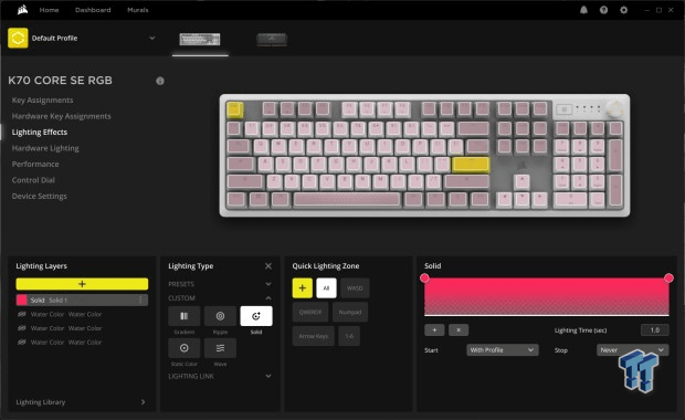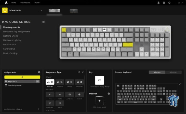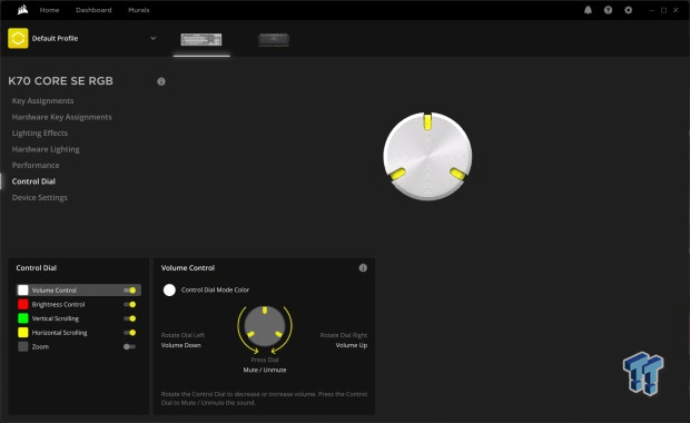 iCue, Kontrol Kadranında ayarlamalar yapabileceğiniz yerdir, ancak erişebileceğiniz tek şey, çeşitli modlardan hangisini etkinleştirmek veya devre dışı bırakmak istediğinizi seçip seçebilmektir.Kontrol Kadranı için makro oluşturamamanız ya da tam olarak programlayamamanız üzücü ama bu bir sorun değil çünkü sunulan özellikler üretkenlik için harika. Ses seviyesi, parlaklık, dikey kaydırma, yatay kaydırma ve yakınlaştırma kontrollerine sahipsiniz. Corsair’in iCUE ile yaptığı harika bir şey, tuş ve aydınlatma özelleştirmesi için yazılım ve donanım atamalarını ayırmaktır.Bu, tüm özelleştirmeleri yazılıma bağlayabileceğiniz veya doğrudan Corsair K70 CORE SE’nin beş yerleşik profilinden birine kaydedebileceğiniz anlamına gelir.