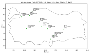 29 Aralık-31 Ocak tarihleri arasında Adıyaman, Şırnak, Hakkari, Siirt, Van, Mardin, Ağrı, Batman, Iğdır, Bitlis, Kars, Muş, Ardahan, Antalya, Bingöl, Tunceli, Gümüşhane, Bayburt, Artvin, Rize, Erzurum, Malatya, Erzincan, Şanlıurfa, Trabzon, Tokat, Amasya, Manisa, Sivas, Kastamonu, Aydın, Giresun, Kilis, Sinop, Niğde, Ordu, Aksaray, Karabük, Samsun, Nevşehir ve Bartın’da kuralar çekildi. Bu sayede 41 ilde toplam 144 bin 258 sosyal konutun hak sahipleri noter huzurunda belirlendi.